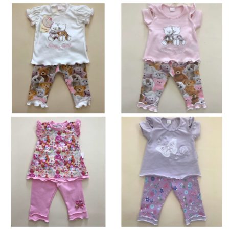 Nyári garnitúra kislányoknak. Felső rész, könnyű kis póló. Fehér, rózsaszín és lila felső hímzett, pamut anyagból, lila és rózsaszín különleges váll megoldással, rövid illetve ujjatlan változatban. Ciklámen ujjatlan felső pamutvászonból. Halász nadrág rugalmas pamut anyagból, kettő nadrág 3D maci mintával. Anyagösszetétel: nadrág: 95 % pamut, 5 % elasztán, fehér póló: 100 % pamut, ciklámen póló: 100 % pamutvászon, lila és rózsaszín póló: 95 % pamut, 5 % elasztán.